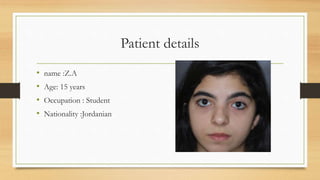 This case presentation summarizes the orthodontic treatment plan for a 15-year-old female patient. The patient presented with spaced upper teeth and a crossbite on the right side. The examination revealed Class II malocclusion, missing upper lateral incisors, and crowding. Treatment aims to widen the maxilla with rapid palatal expansion, align the arches with fixed appliances, and achieve a Class I occlusion. The plan includes expansion, molar derotation, fixed appliances, space maintenance for future prosthetics, and retainers.