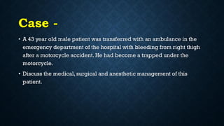 The document presents a detailed case study of a 43-year-old male patient, Mr. Harshad Ram Khade, who was admitted to the emergency department with a right femoral shaft fracture resulting from a motorcycle accident. It outlines the medical, surgical, and anesthetic management of the patient, including emergency interventions, pre-operative assessments, and the surgical procedure of closed reduction internal fixation with intramedullary interlocking nailing. The case concludes with the patient being discharged after 12 days of recovery and rehabilitation.