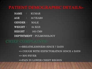 This document presents a case study of a 50-year-old male patient admitted to the pulmonology department with acute respiratory failure. The patient reported symptoms of breathlessness, cough with expectoration, fever and chest pain. On examination, the patient had elevated temperature, blood pressure, pulse and respiratory rate. Based on the patient's history of COPD and investigations, he was diagnosed with acute respiratory failure. His treatment plan included antibiotics, bronchodilators and corticosteroids.