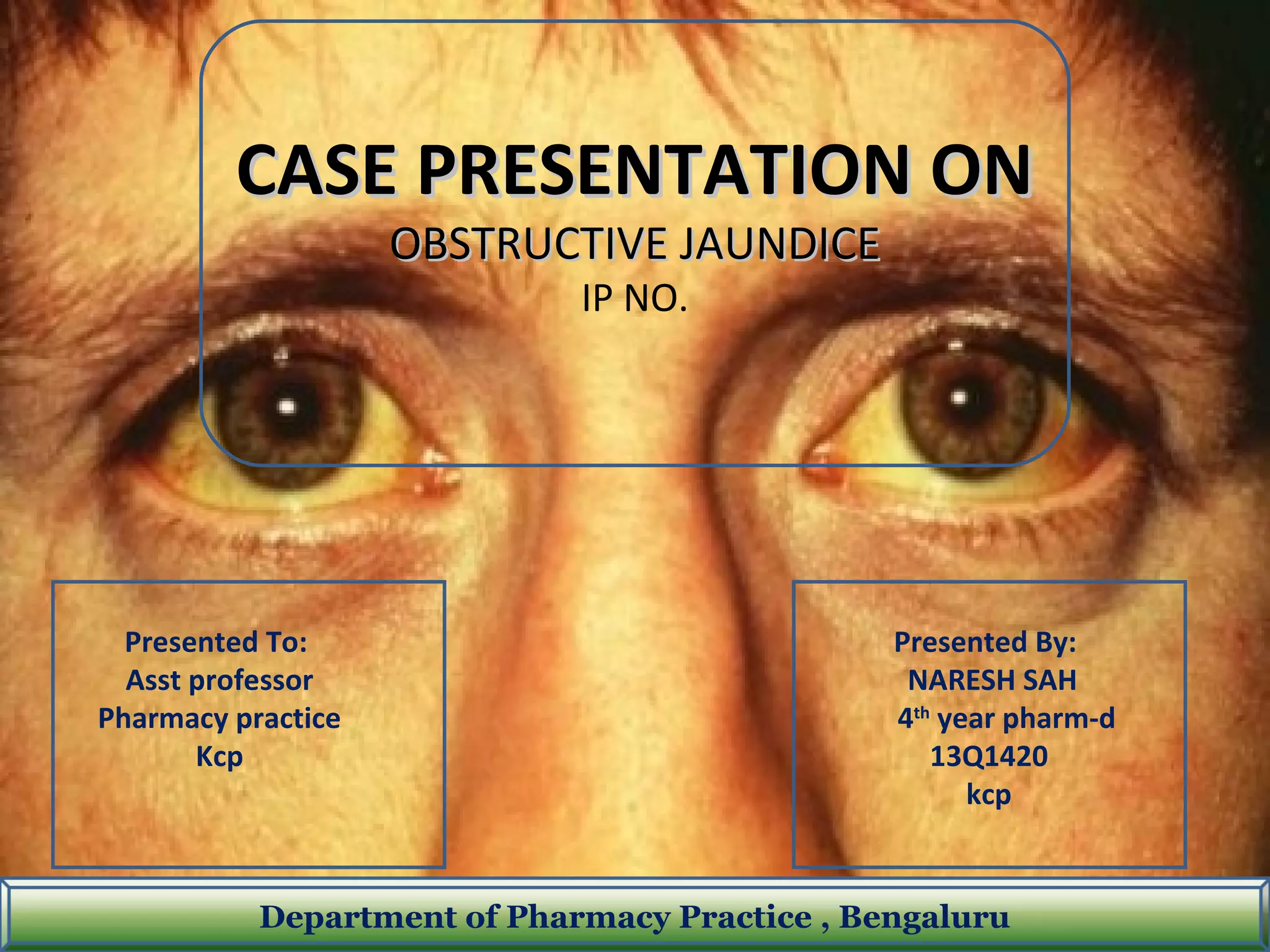 The document provides a case presentation on obstructive jaundice in a 43-year-old male patient. It includes demographic details, medical history, subjective and objective evidence from examinations and lab reports, medications, progress notes, assessments, care plan, pharmacist interventions, and patient education. The assessments determined the patient had obstructive jaundice likely due to periampullary carcinoma. Treatment included antibiotics, analgesics, vitamins, and surgery to remove the tumor, with the goals of reducing fever, itching, and jaundice which were achieved.
