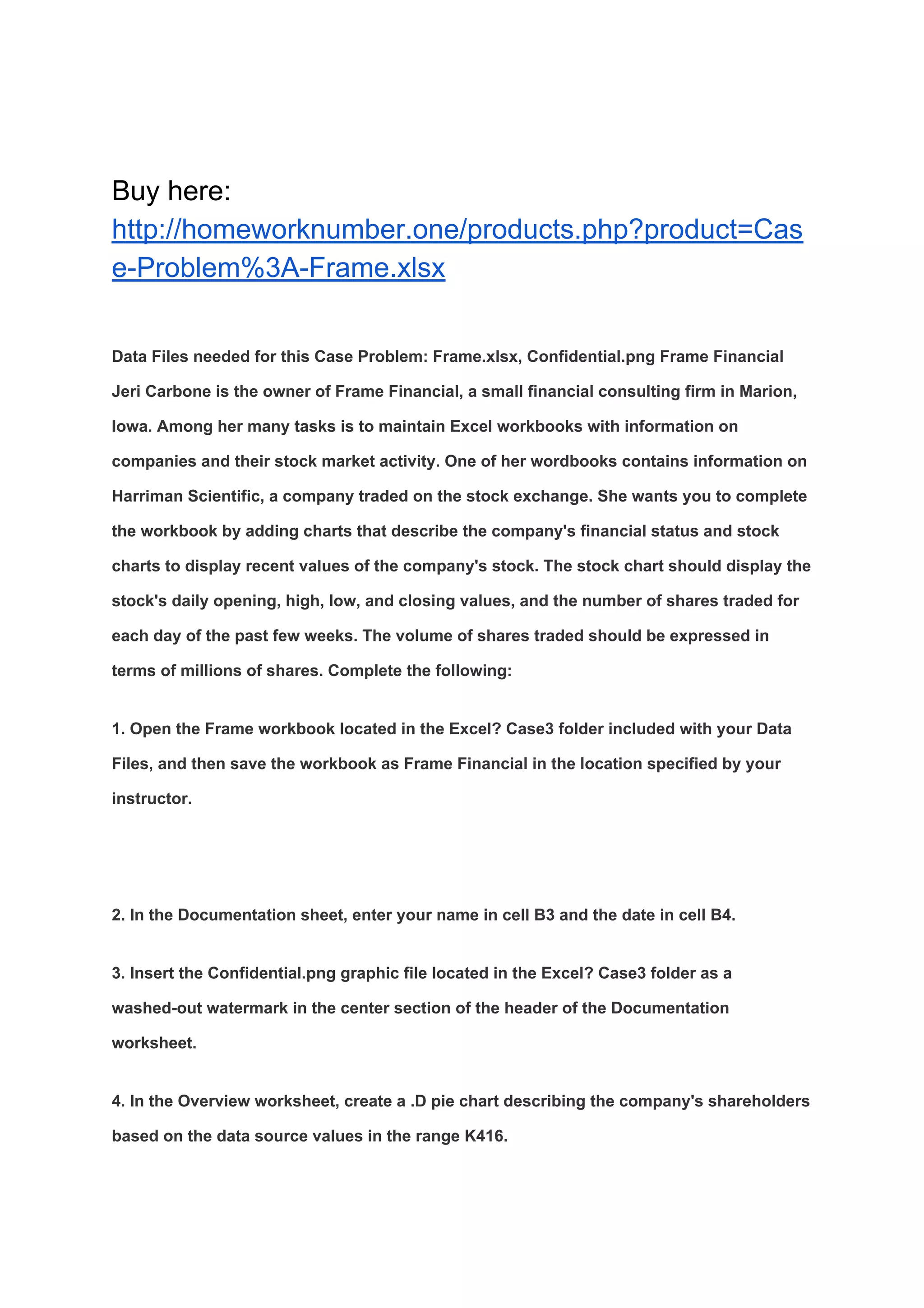 Jeri Carbone owns Frame Financial, a small financial consulting firm. She maintains Excel workbooks with information on companies and their stock market activity. She asks you to complete a workbook with information on Harriman Scientific by adding charts describing the company's financial status and stock performance. You are instructed to add a pie chart showing the company's shareholders, add data bars to values in one range, and move a 3D clustered column chart of revenue and expenses to a different worksheet.