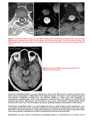 This patient presented with transverse myelitis involving the cervical spinal cord, with a history of previous transverse myelitis in the dorsal region and left optic neuritis. MRI showed longitudinally extensive lesions involving the cervical and dorsal spinal cord and left optic nerve enlargement. This clinical and radiological picture is consistent with neuromyelitis optica (NMO), also known as Devic's disease, an inflammatory disorder that predominantly involves the optic nerves and spinal cord. NMO can be difficult to distinguish from multiple sclerosis but tends to cause more severe episodes of optic neuritis and transverse myelitis.