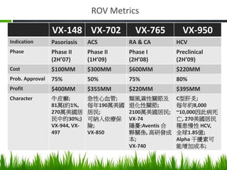 Vertex Pharmaceuticals is evaluating its R&D portfolio and must decide which projects to advance in development. The portfolio includes projects for pasoriasis (VX-148), acute coronary syndrome (VX-702), rheumatoid arthritis and osteoarthritis (VX-765), and hepatitis C (VX-950). The summary provides details on the development phase, estimated costs, probability of approval, and potential profits for each project.