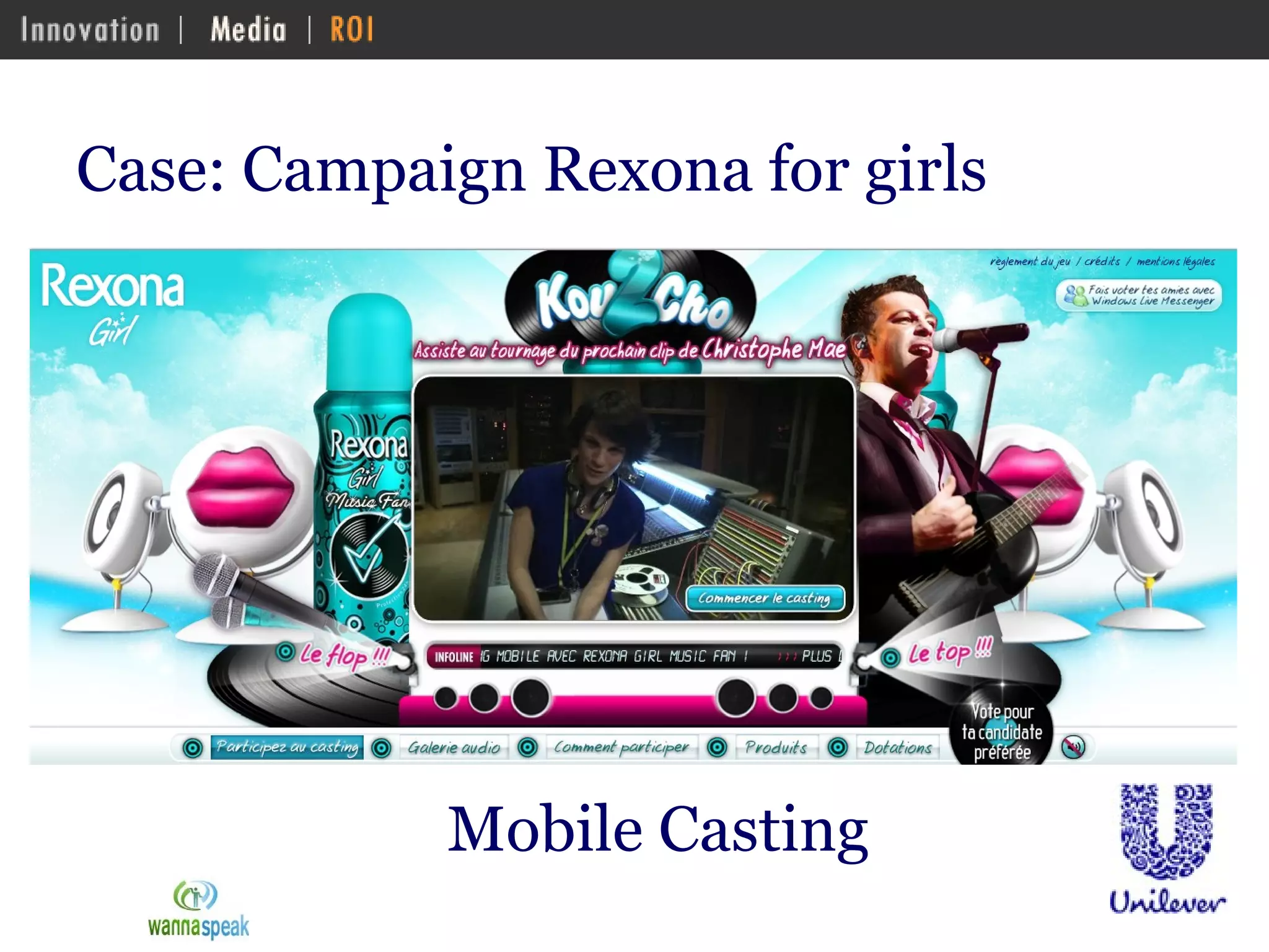 Nina explains to the user that they can participate in an online casting for a Rexona campaign for girls by registering and completing their information. She invites the user to meet the casting team and participate in a call where they will be asked to sing along with music. The campaign was hugely successful, receiving over 10,000 registrations in the first week and 35,000 total. Users could vote for each other and check their performance results. The site became very popular with over 1 million page views.