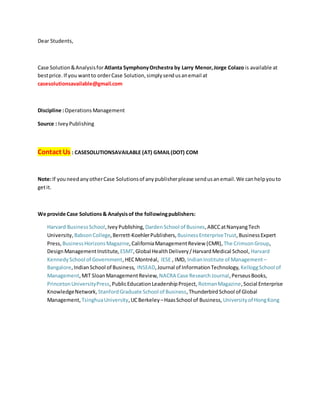 This email advertises a case solution and analysis for the Atlanta Symphony Orchestra case from Ivey Publishing. It provides contact information to order the case solution by email. It also lists many other publishers and schools whose case solutions they can provide upon request.