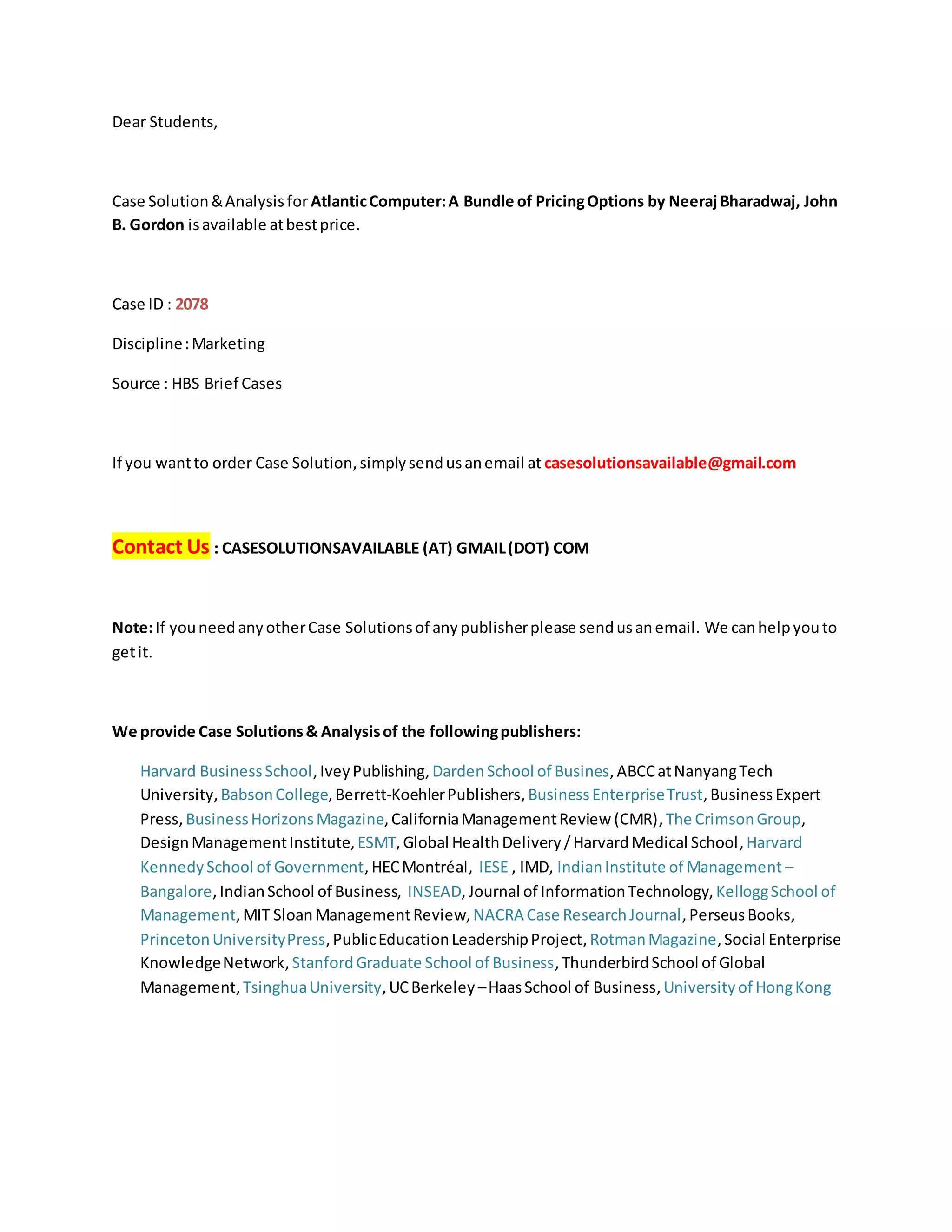 The document is a promotional message for case solutions and analyses, specifically for a case on pricing options by Atlantic Computer. It provides contact information for ordering and mentions a variety of publishers for whom case solutions are available. The email contact for inquiries is also included.