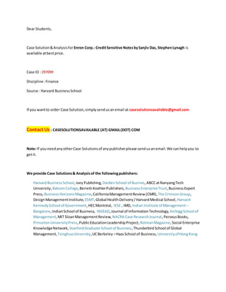 This email provides information about a case solution for an Enron Corp. case study from Harvard Business School. It details the case identification number, discipline, source, and contact information for ordering the case solution. It also lists several publishers and business schools for which it can provide additional case solutions and analyses.
