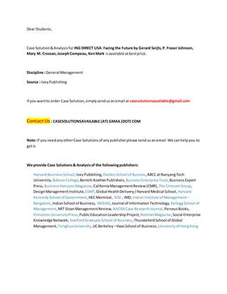 This document offers case solutions and analyses for various academic publishers, including Harvard Business School and Ivey Publishing. Students can order solutions by emailing the provider at the specified address. Additionally, the document suggests that they can help with case solutions from a wide range of other publishers.