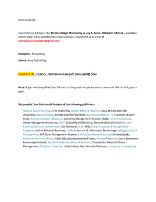 This email advertises a case solution for the case study "Merlin's Magic Mansion" by Lesley A. Burns and Richard H. Mimick. It provides contact information for ordering the case solution and notes that solutions to cases from various prominent publishers can be obtained by emailing the provided address. The email lists many business schools and publishers whose case studies they can provide solutions for.