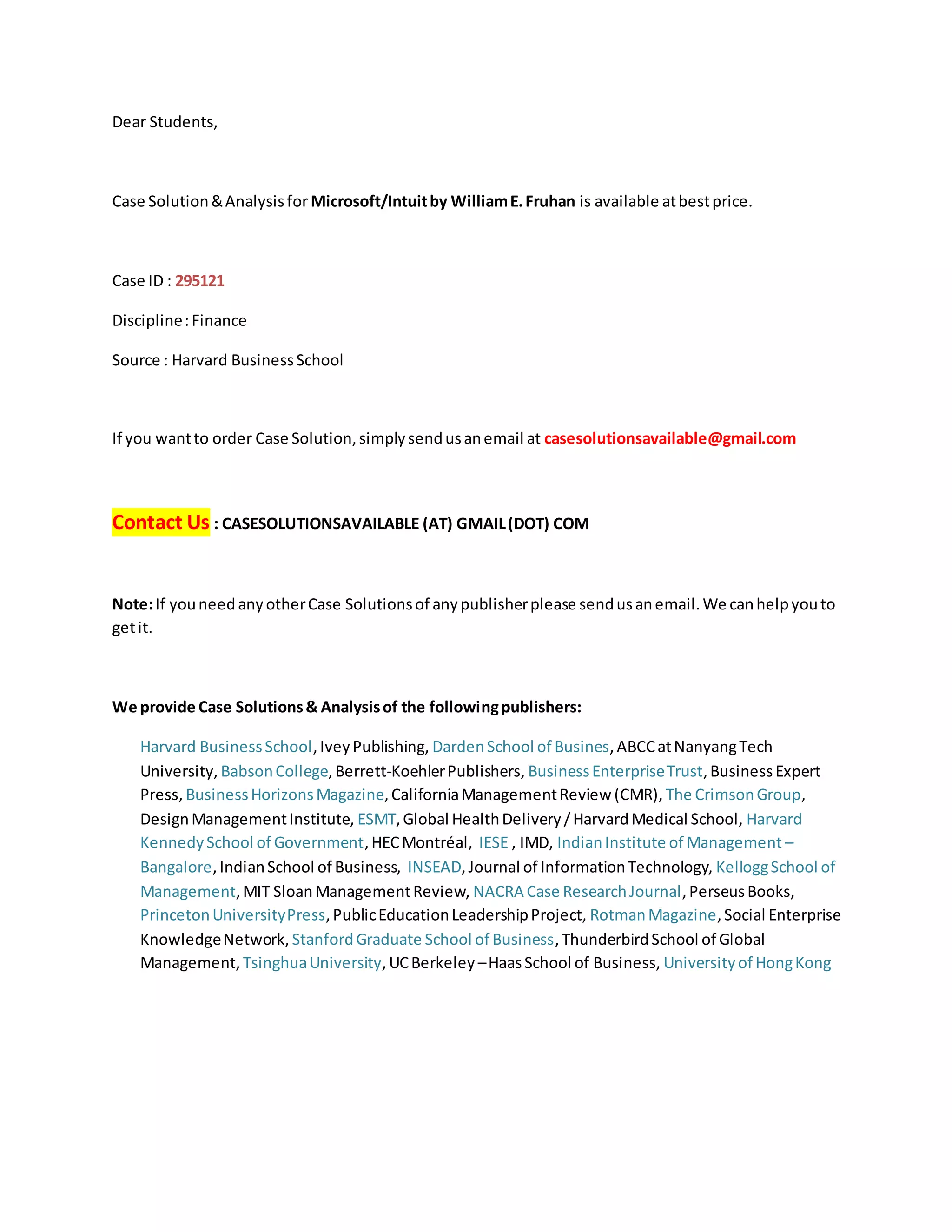 This document is an email advertising case solutions and analyses from various publishers such as Harvard Business School and Ivey Publishing. It provides information on how to order a case solution for the Microsoft/Intuit case from Harvard Business School for the best price by emailing casesolutionsavailable@gmail.com. It also notes that other case solutions from various publishers can be obtained by email.