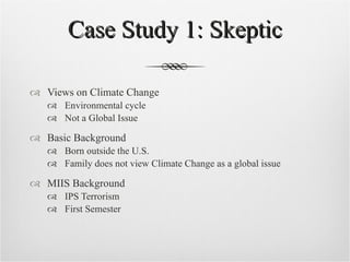 This document presents three case studies of individuals with different views on climate change: a skeptic, middle stance, and environmentalist view. It also provides basic background on each individual's family, interests, and education. Finally, it proposes four potential hypotheses about what may influence people's attitudes on climate change, such as investment interests, discussions with family/friends, education levels, or how immediate they view the problem.