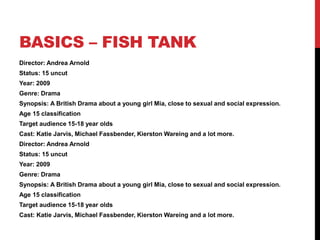 The document provides case studies and information about several films: Fish Tank, Ill Manors, The Hangover, and Skyfall. It includes details about directors, casts, budgets, box office figures, production and distribution companies, technological convergence aspects, and issues with national and local audiences. Cross-media promotion strategies and the impact of media ownership models (from independent to large conglomerates) on film production are also examined.