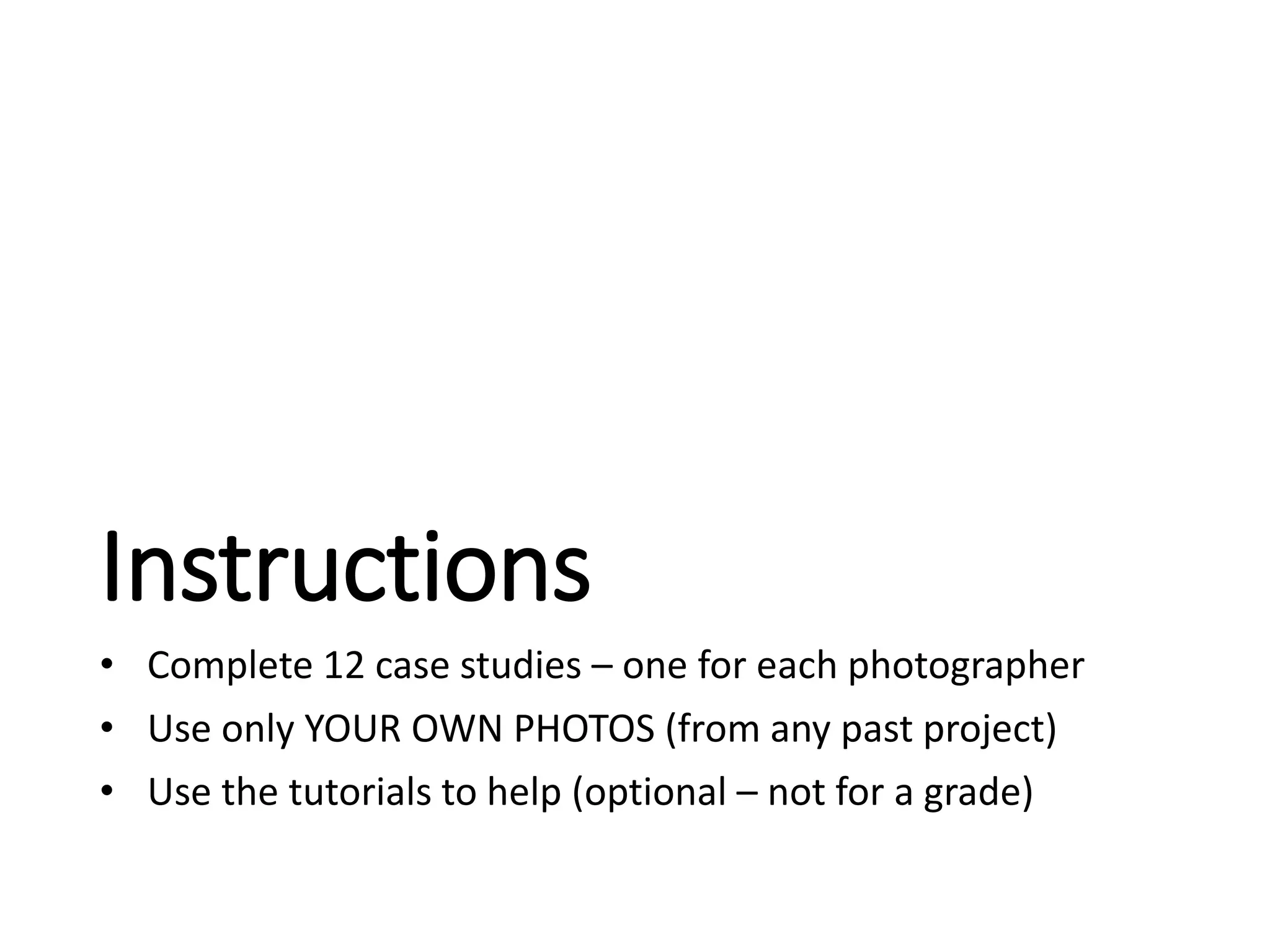 The document provides instructions and tutorials for completing 12 case studies matching the style and subject matter of different photographers. Students must use their own photos and figure out how to match the style without being provided steps. Tutorials are optional and provide techniques for manipulating photos to match various effects, including turning images black and white, adding sepia tones, blurring, combining multiple exposures, thresholding to simplify tones, and merging two photos. The goal is to replicate the styles of photographers like Ansel Adams, Alfred Stieglitz, Annie Leibovitz and others.