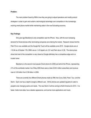 RIM currently faces challenges from competitors in the evolving smartphone market. The document proposes that RIM focus on expanding the depth of its existing 5 smartphone models through continued improvements and new applications, rather than introducing new models. This will allow RIM to better utilize resources, maintain brand recognition, and close gaps with competitors like the iPhone by offering more applications. The plan involves halting new phone development, shifting resources to applications, extensive marketing of new applications, and offering some for free to appeal widely.