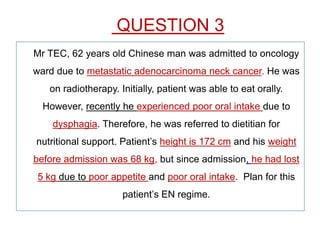 Mr. TEC is a 62-year-old Chinese man admitted to the oncology ward due to metastatic adenocarcinoma neck cancer. He has experienced weight loss and dysphagia. A nutritional plan is developed to provide adequate calories and nutrients through enteral nutrition via 6 feedings per day of a specialized formula. The plan will be gradually increased over 4 steps to reach goals of 2442 kcal, 133.2 g protein, and 399.9 g carbs to support weight gain and prevent further malnutrition.