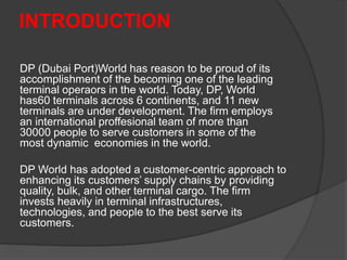 DP World has become one of the leading global terminal operators, with 60 terminals across 6 continents and over 30,000 employees. It has adopted a customer-centric approach, investing heavily in terminal infrastructure, technology, and personnel to enhance customers' supply chains and provide quality cargo handling. RFID technology from Identec Solutions has helped DP World increase efficiency in container handling and truck turnaround at terminals, improving supply chain effectiveness and customer satisfaction.