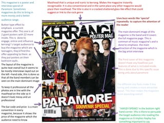 Kerrang! is a weekly British rock music magazine published by Bauer Media that targets 16-24 year olds. It includes interviews, reviews, news and posters related to rock music. This particular issue focuses exclusively on the band Paramore and features a two page spread interview with the lead singer Hayley Williams. The magazine maintains a consistent style across articles with use of fonts, colors and graphics to appeal to its target audience.