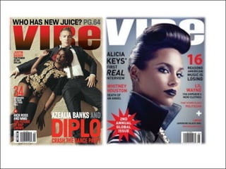 Vibe magazine was launched in 1993 by Quincy Jones in partnership with Time Inc. to cover hip hop and R&B artists, actors, and entertainers. The magazine's target audience is youth interested in hip hop culture. Vibe became well-known for its creative covers and began publishing books on hip hop culture. While it stopped printing physical issues in 2009, it continues sharing urban news online. The magazine consists of approximately 75 glossy, colored pages issued monthly. It maintains a 60:40 ratio of images to articles and does not include many advertisements on its covers.