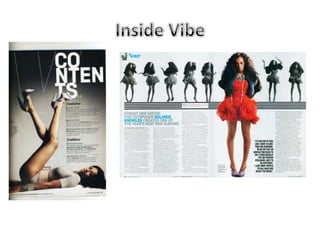 Vibe is a monthly music magazine focused on R&B and hip-hop artists that was founded in 1993 by music producer Quincy Jones. It features interviews, reviews, gossip and information on new music and tours aimed at its target demographic of 16-25 year old urban music fans. While other magazines focus more on rap or rock, Vibe aims to cover a broader range of interests within hip-hop culture through its mix of images and articles.