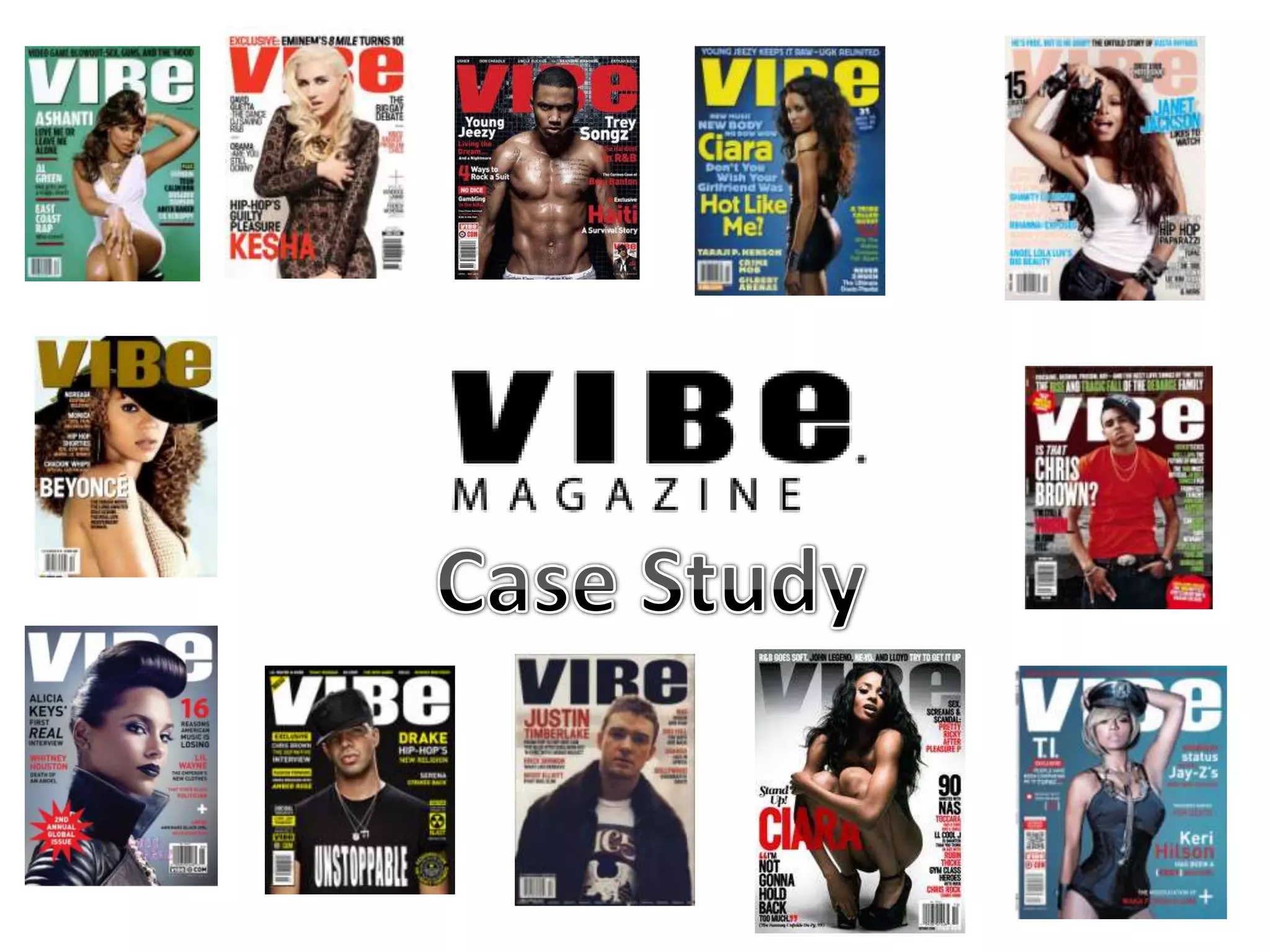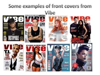 Vibe is a monthly music magazine founded in 1993 by Quincy Jones that focuses on R&B and hip-hop artists. It features interviews, photos, and information about new music and releases. While it shut down briefly in 2009, it was purchased by InterMedia Partners and continues publication today both in print and online. The magazine targets young, urban audiences interested in hip-hop culture through its coverage of prominent artists like Nicki Minaj and Drake. It also discusses films, fashion, and other entertainment relevant to its readership.