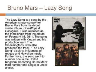 The Lazy Song is a 2011 single by Bruno Mars from his debut album. The song was written with K'naan and produced by The Smeezingtons. It displays influences of reggae and Hawaiian music. The music video for The Lazy Song focuses on Bruno Mars' performance of the song, with actors dressed as monkeys dancing in the background. It closely follows conventions of the pop/R&B genre through its upbeat, performance-based style and bright tone. The lyrics and visuals are closely linked throughout the video through gestures and movements that represent the words.