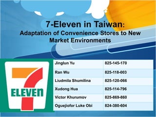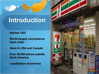 7-Eleven first originated in the United States in 1927 and has since expanded internationally. In Taiwan, 7-Eleven has localized its operations to better suit the local market. Stores are half the size of US locations and offer customized products. 7-Eleven in Taiwan has found success through its wide coverage of over 5,000 stores located near residences and open 24/7. It has strengthened the convenience store concept in Taiwan by adding local foods and providing handy mobile services. While based on the same universal model as 7-Eleven in the US, its localization strategies of differentiated products and services have driven its competitive advantage in Taiwan.