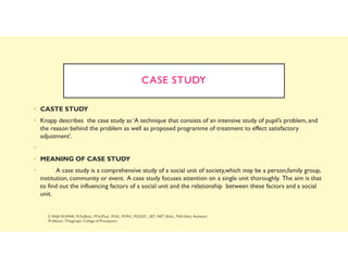 The document discusses the case study method as an intensive and comprehensive research technique focused on a social unit, such as a person or community, to understand influencing factors and their relationships. It outlines the steps involved in conducting a case study, as well as its advantages, such as deep analysis and hypothesis formulation, and disadvantages, including limited generalizability and susceptibility to biases. Overall, the case study method is highlighted as valuable for diagnosis and treatment in educational and counseling contexts.