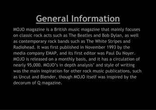 MOJO magazine is a British music magazine published monthly that focuses on classic rock bands and contemporary rock music. It targets intelligent male rock fans of varying ages through its mix of coverage of established artists alongside new music. The magazine contains in-depth album reviews, interviews, and lists alongside advertisements for concerts and albums. MOJO strives to appeal to both older and younger readers through its balanced use of images and text alongside a style that combines formal elements with a colloquial tone.
