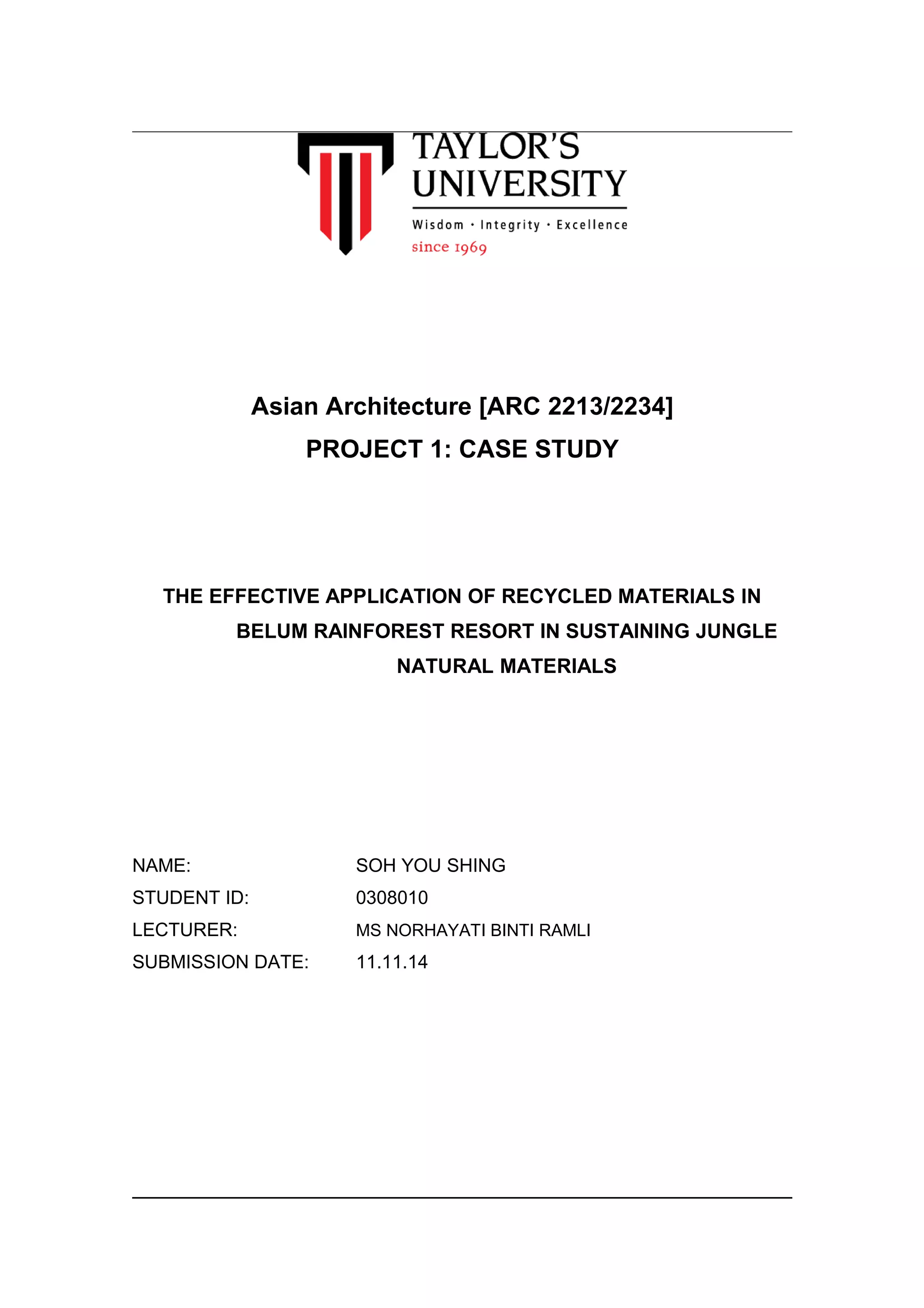 The document discusses the effective application of recycled materials at the Belum Rainforest Resort in sustaining natural jungle materials. It focuses on four main recycled materials used - rammed earth, bamboo, belian wood saplings and bricks. These materials have low embodied energy, require minimal maintenance energy, and are effective in sustaining natural materials through their lifecycle assessment. Other potential recycled materials discussed include using broken glass bottles for wall cladding and cardboard for honeycomb insulation.