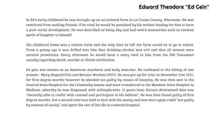 Ed Gein grew up isolated on a farm in Wisconsin with a domineering mother. He had poor social development and strange mannerisms. Gein confessed to killing two women and was found to have made trophies and decorations from human remains in his home. He was declared legally insane and spent the rest of his life in mental hospitals. Gein inspired characters in Psycho, The Texas Chain Saw Massacre, and The Silence of the Lambs through his horrific crimes and trophy keeping. The document proposes making a film with a secretive killer inspired by Gein, set in an isolated location like his childhood farm.