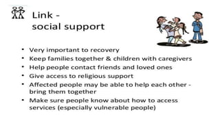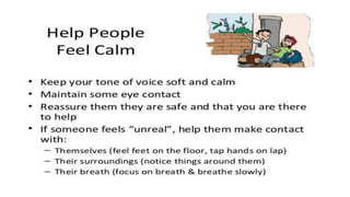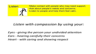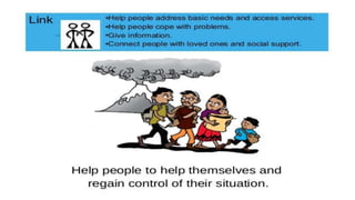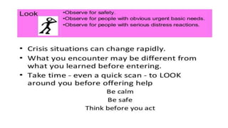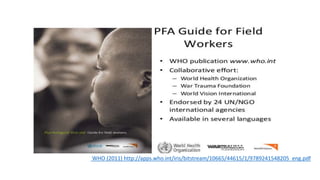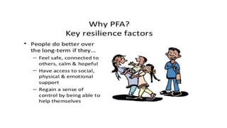This document provides guidance on psychological first aid (PFA) for those assisting refugees and migrants. It defines PFA as a humane and supportive response to people in distress after a traumatic event. The summary outlines key aspects of PFA, including assessing needs, providing practical assistance, listening without pressure, and linking people to services and social supports. A case scenario describes applying PFA when encountering an unaccompanied minor refugee, emphasizing the need to satisfy basic needs, protect from harm, and connect the child to loved ones and services for care.