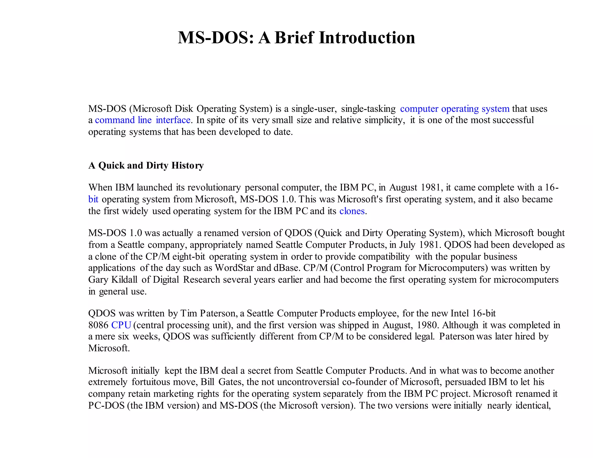 MS-DOS was one of the most successful operating systems and was the first widely used operating system for IBM PCs and clones. It originated as QDOS, an operating system written in six weeks for the Intel 8086 CPU. Microsoft acquired QDOS and renamed it MS-DOS, which it licensed to IBM for use on the original IBM PC. MS-DOS went on to fuel Microsoft's growth as the dominant software company. While feature-limited compared to UNIX, MS-DOS remained popular for years until the rise of graphical user interfaces led to its replacement by Windows 95.