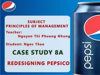 The document discusses redesigning the organization structure of PepsiCo to better facilitate marketing integration across its major brands. It recommends that the Chief Marketing Officer implement a new structure with a single Marketing Manager overseeing the marketing of all beverage brands and another overseeing food brands. Additionally, the document suggests three steps for the CMO to take to further integrate marketing efforts: 1) use neuromarketing to develop products, 2) invest in developing international markets, and 3) focus on maintaining strong customer relationships.