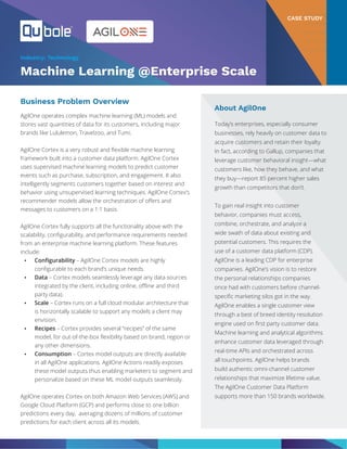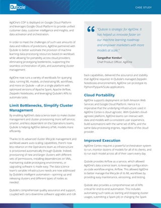Agilone operates a customer data platform that uses advanced machine learning models to predict customer behaviors and personalize marketing efforts for brands like Lululemon and Tumi. The platform, Agilone Cortex, leverages cloud solutions from Amazon Web Services and Google Cloud Platform, allowing for extensive scalability and customizability in handling customer data. Partnering with Qubole, Agilone enhances its data processing efficiency and orchestration capabilities, enabling seamless management of machine learning workflows and improved operational efficiency.