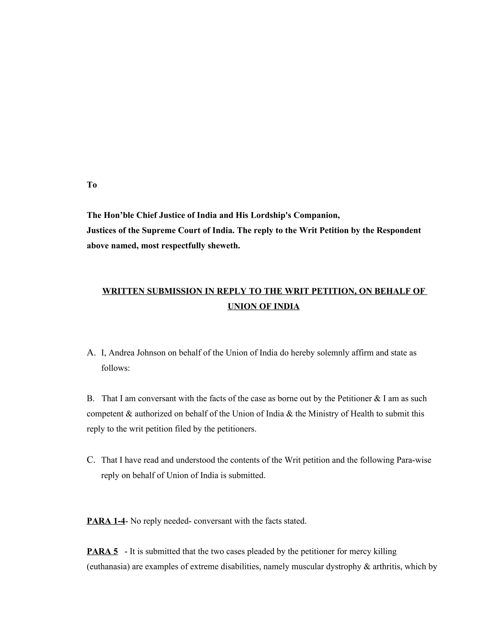 The document is a written submission in reply to a writ petition filed in the Supreme Court of India regarding mercy killing or euthanasia.