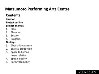 The document provides information on the Matsumoto Performing Arts Centre designed by architect Toyo Ito. Key details include: