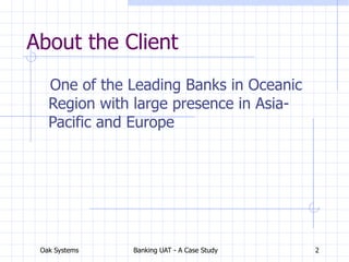This document presents a case study on User Acceptance Testing (UAT) conducted for a leading bank's Asian entities, focusing on various types of loans and external interfaces. It outlines the different testing aspects like minimum acceptance testing, system integration testing, and end-to-end testing, along with the roles and responsibilities of the testing team. The project involved a team of 20 members with experience in banking and testing, working in parallel on multiple tasks to meet project schedules.