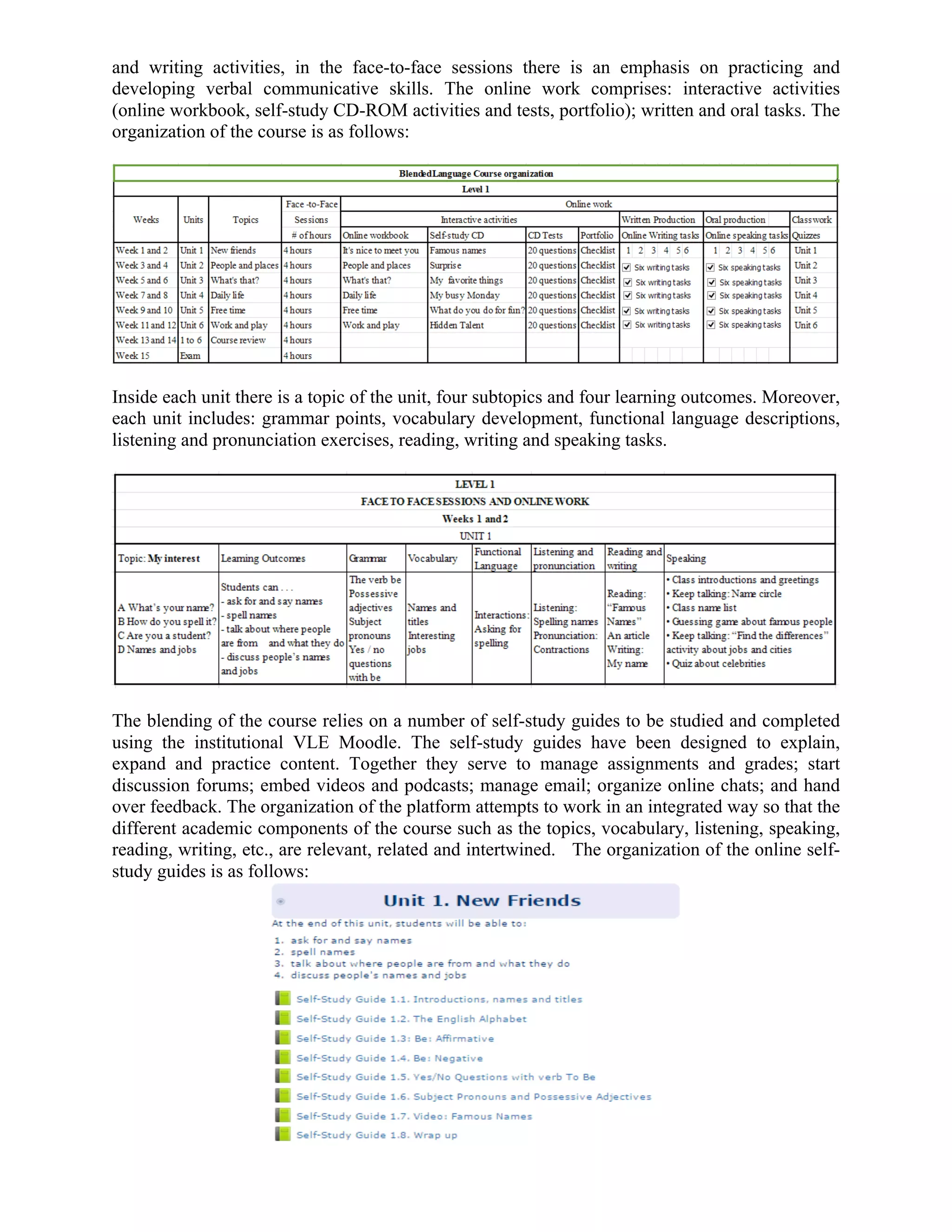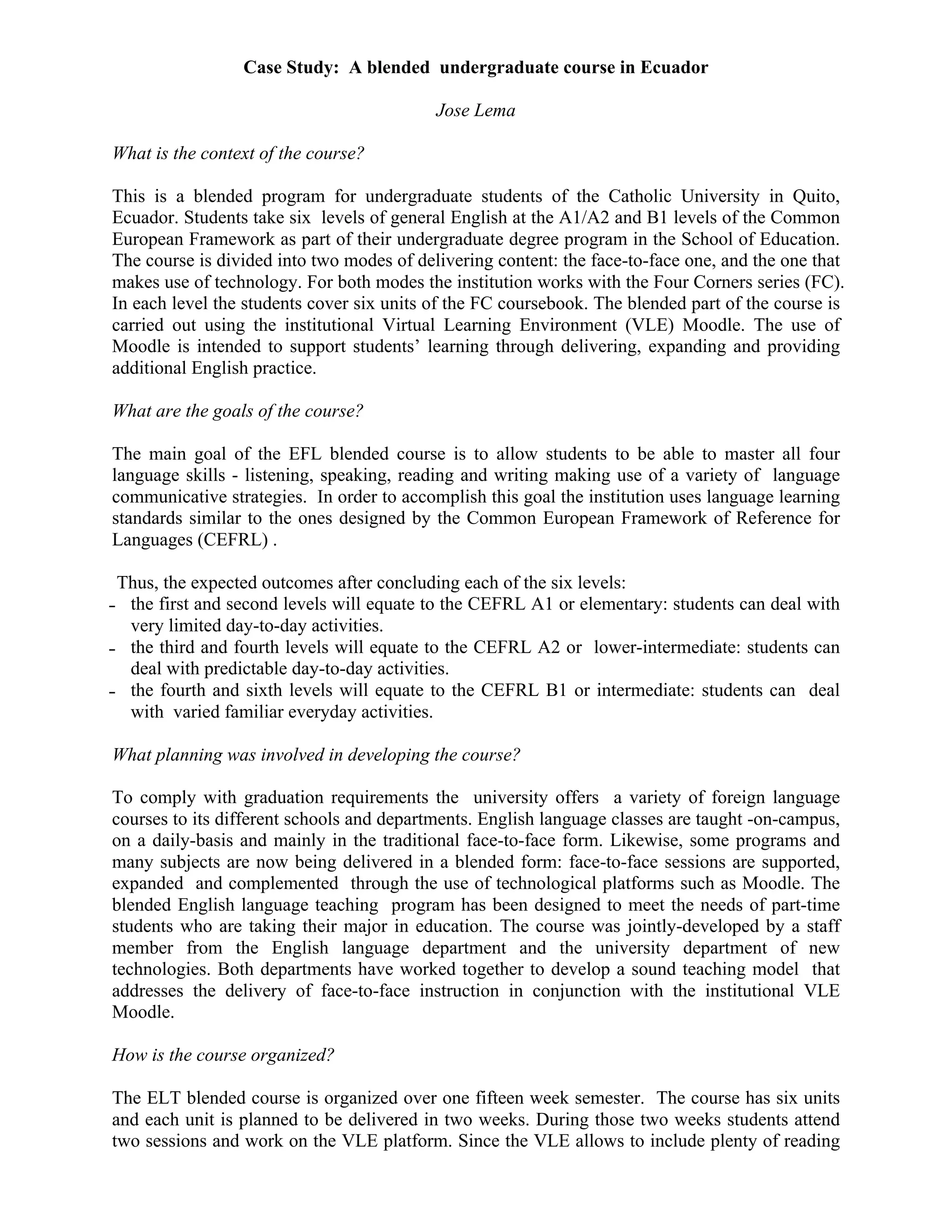 The document outlines a blended undergraduate English course at the Catholic University in Quito, Ecuador, designed for education majors, incorporating both face-to-face and online learning through the Moodle platform. The course aims to develop students' listening, speaking, reading, and writing skills across six levels aligned with the Common European Framework of Reference for Languages, while facing challenges related to technology integration and teacher training. Assessment plays a crucial role, utilizing formative and summative methods to monitor and evaluate student performance throughout the course.