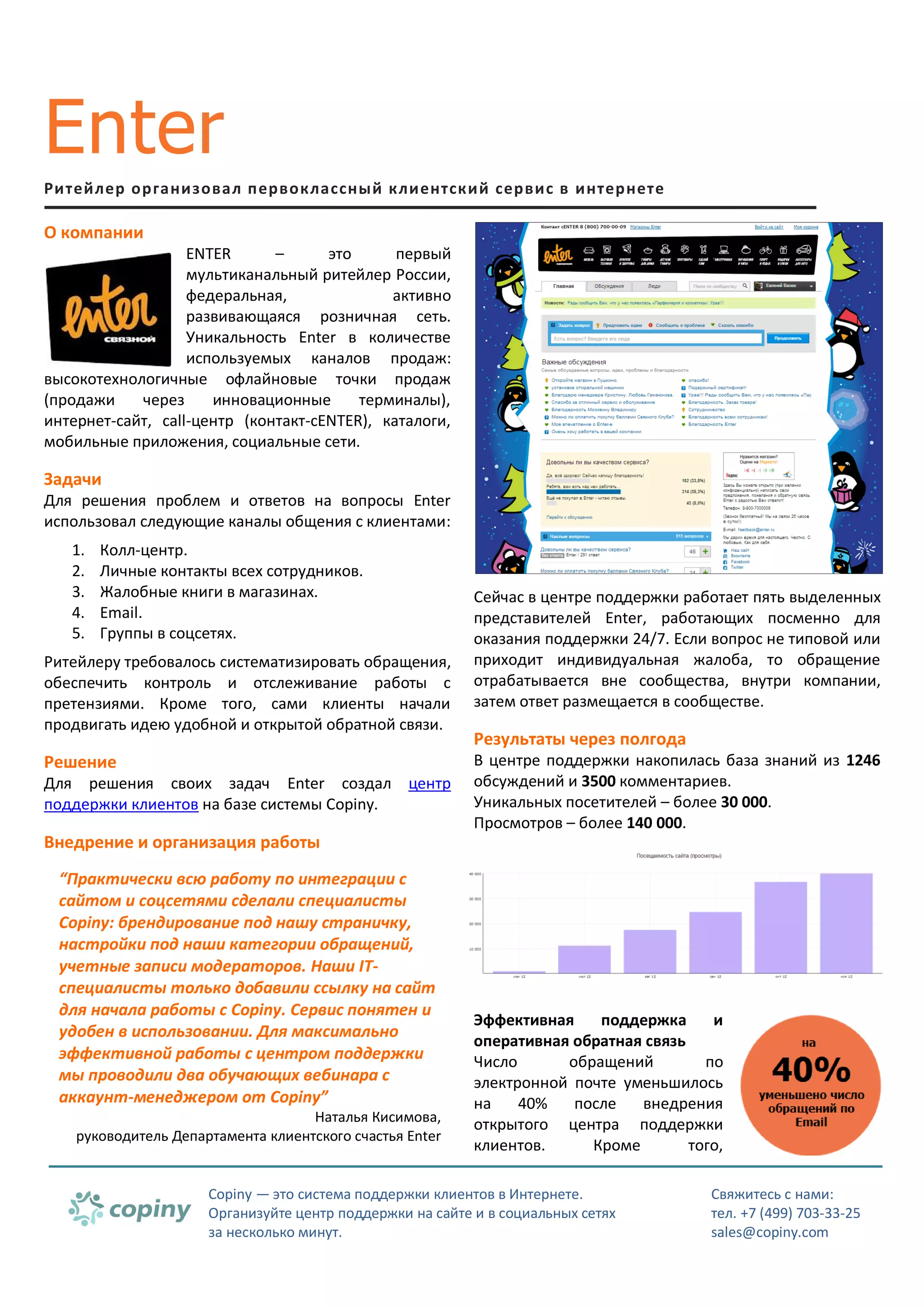 Компания Enter, первый мультиканальный ритейлер в России, организовала центр поддержки клиентов на базе системы Copiny, обеспечивая обратную связь через разные каналы. В результате работы центра за полгода накопилась база знаний из 1246 обсуждений и более 30 000 уникальных посетителей, что способствовало сокращению обращений по электронной почте на 40%. Клиенты положительно отреагировали на новый способ общения, что способствовало росту лояльности и поискового трафика.