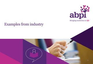 Beyond our medicines– an industry working in partnership  Pharmaceutical members are committed to being in active partnership with the NHS and patient organisations.  Examples of joint working include:  Arthritis Research UK and Pfizer  Implementing NICE Clinical Guidelines on Atrial Fibrillation (CG180) across Oldham CCG using the Rapid Adoption Innovation Framework (RAIF) (Oldham CCG, Boehringer Ingelheim Ltd, Bayer PLC, and Pfizer Ltd)  Salford Lung Study - working with GSK, North West e-Health (NWEH), The University of Manchester, Salford Royal NHS FT, University Hospital of South Manchester (UHSM), NHS Salford and GPs and community pharmacists.  Brighton & Hove CCG and NHS Grampian Joint Working projects with GSK aim to support the delivery of improved patient adherence, medicines optimisation and reductions in medicines wastage, by rolling out the “Complete The Cycle” inhaler recycling scheme to local pharmacies and through training and up skilling pharmacists involved in this project. 96