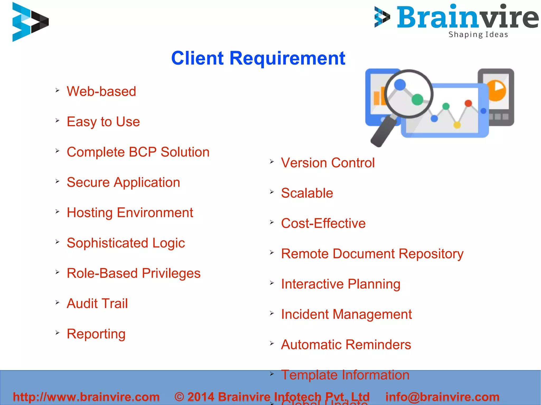 The document outlines a case study for an enterprise risk management software solution provided by Brainvire Infotech Pvt. Ltd., focusing on client requirements such as web-based accessibility and secure application features. It highlights project challenges, the technologies used, and the architectural design, including database management and user interface components. Additionally, it details the project's manpower and planning considerations, underscoring the importance of crisis management and data replication methodologies.