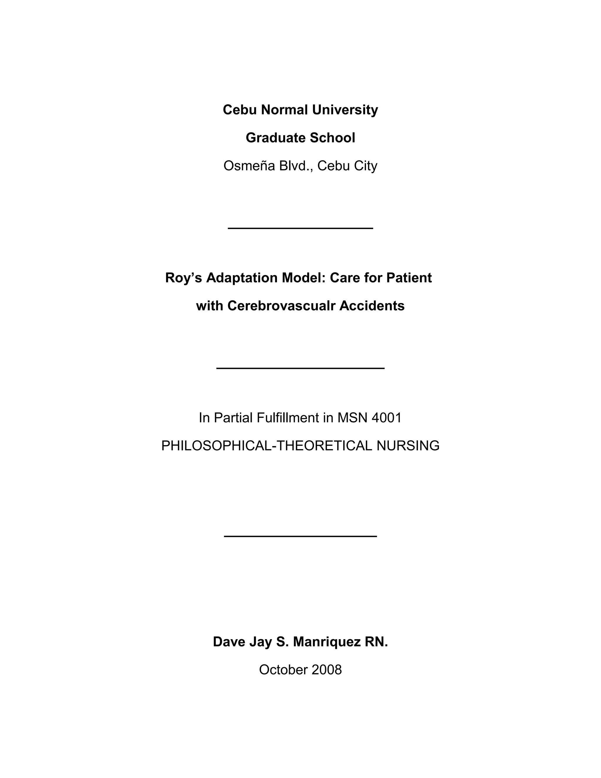 This case study explores the use of Roy's Adaptation Model in caring for a 60-year-old male patient diagnosed with post-infarct seizure and cerebrovascular accident. Utilizing the nursing process and Roy's model, the study assessed alterations in the patient's adaptive modes of physiologic needs, self-concept, role function, and interdependence. The study concluded that CVA patients experience adaptive problems in all four modes and recommended the use of Roy's model to guide nursing care and promote adaptive responses to improve patient outcomes.