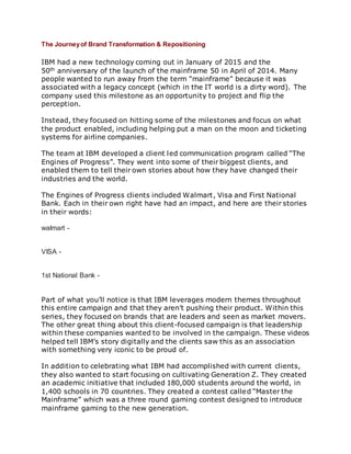 IBM faced the challenge of changing perceptions of their mainframe product as the cloud was becoming more popular. They launched a marketing campaign called "The Engines of Progress" featuring stories from major clients like Walmart and Visa about how IBM's mainframes helped transform their industries. The campaign included videos, events, and a student competition. It was highly successful, generating over 100 million social impressions and increasing IBM's annual revenue by 20%.