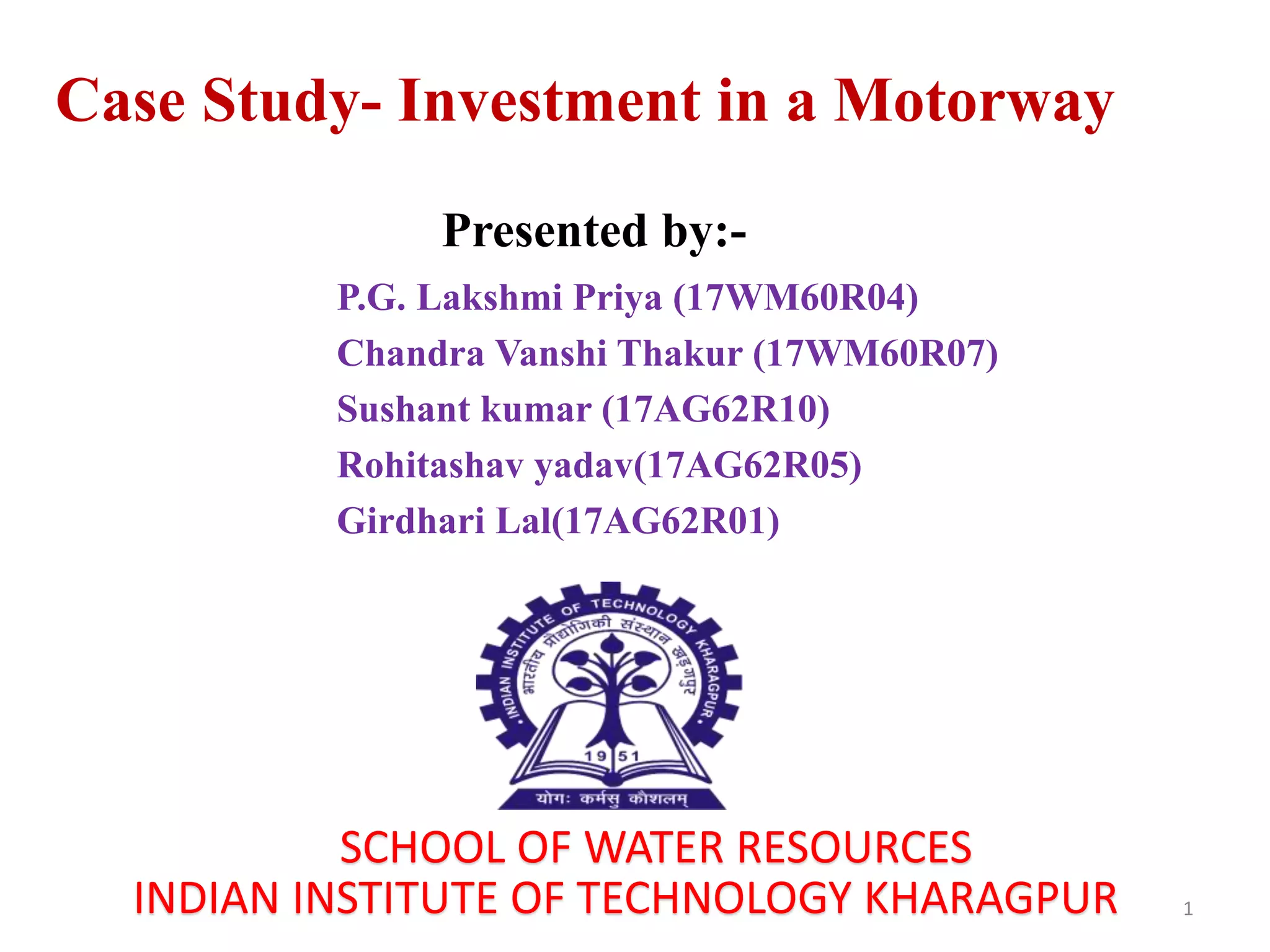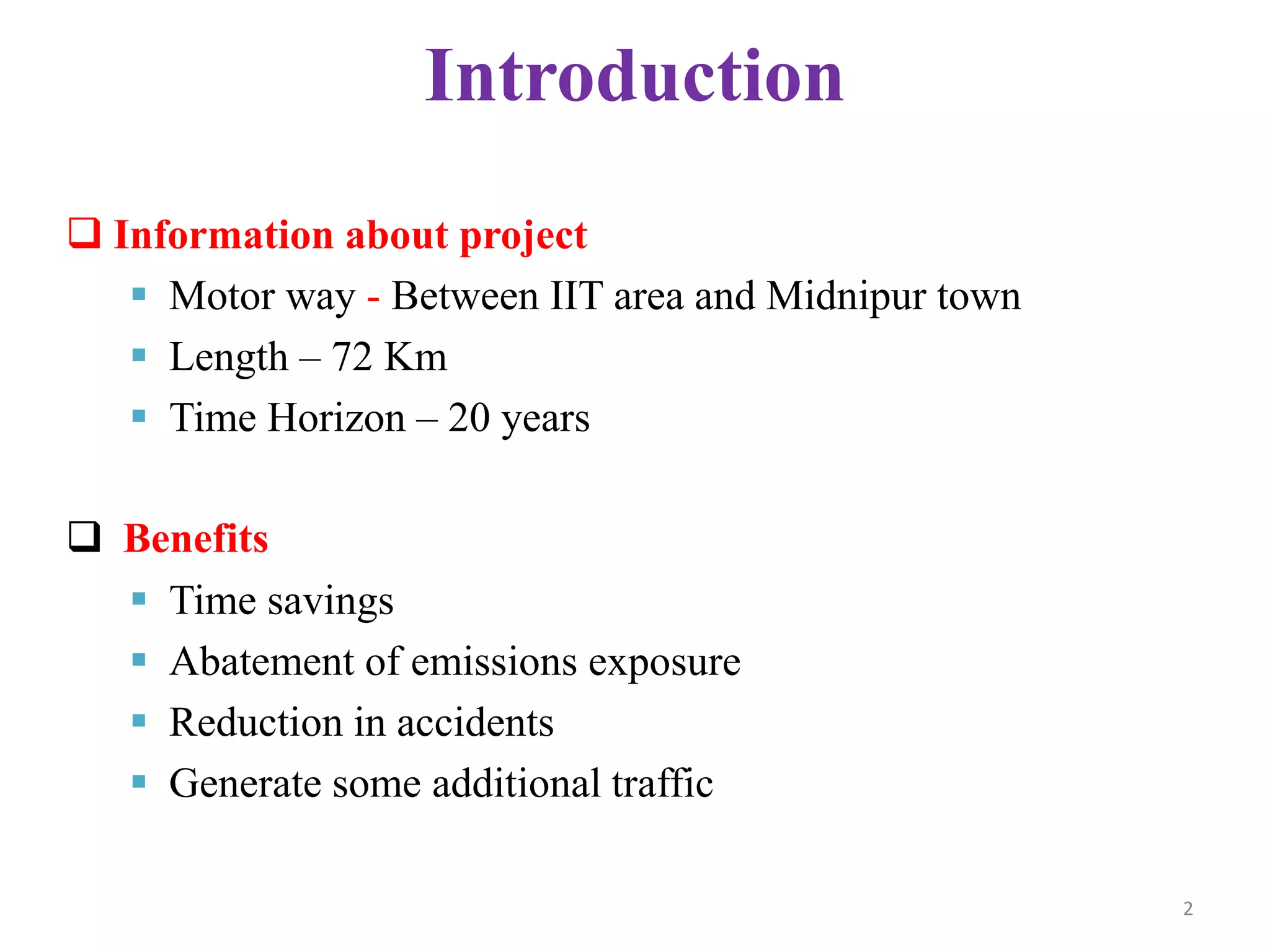 This document presents a financial analysis of a motorway project between IIT Kharagpur and Midnapore Town, spanning 72 km over 20 years. It details investment costs, operating expenses, revenues, and cash flows, projecting a positive net cash inflow by year 4 and emphasizing the importance of toll revenues for financial sustainability. Additionally, economic benefits such as time savings and accident reductions are quantified, with a focus on calculating the net present value and internal rate of return of the investment.