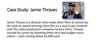Jamie Thraves started his directing career by making low-budget music videos for £5,000 each after using an award-winning short film to join a video production company. He then directed videos for Radiohead's "Just" and Coldplay's "The Scientist" with budgets of £100,000 and £200,000 respectively, which brought him breakthrough success. Thraves has since used his success with music videos to transition into directing feature films.