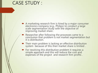 A marketing research firm was hired by an electronics company to conduct a segmentation study, but the researcher found the main problem was distribution. Disclosing this could reduce profits for the research firm but conducting the originally requested study may not help the client. The researcher must decide whether to prioritize ethics over profits by telling the client about the real issue, or do the requested but less useful study. Both parties should focus on building trust through open communication and cooperation to find an ethical solution that benefits all.