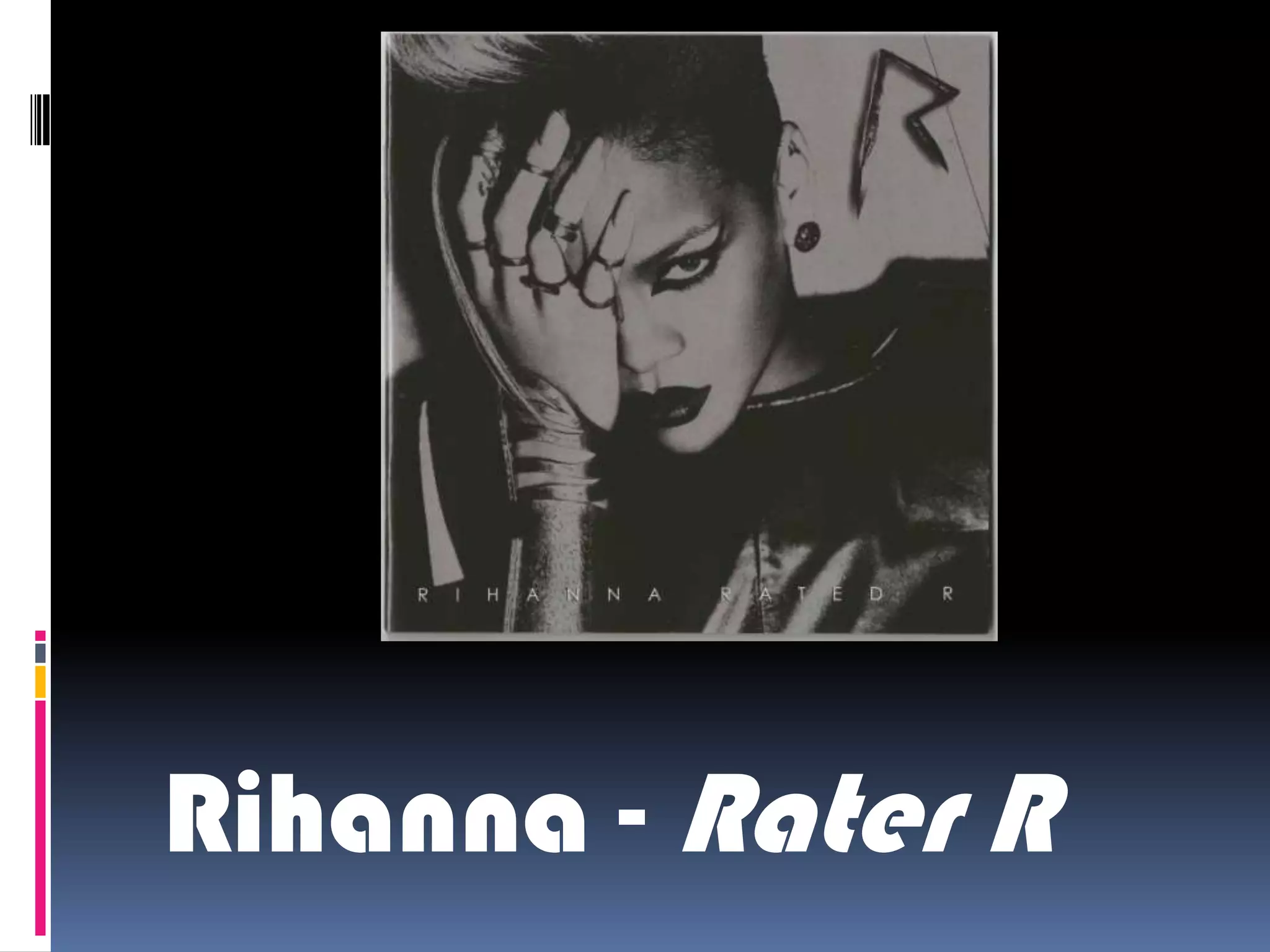 Rihanna's album "Rated R" features dark and moody imagery throughout that conveys a sense of maturity and sophistication. The album cover shows Rihanna in a contemplative pose with one eye covered, denoting the personal nature of the album conceived after her assault. In black and white, it intrigues viewers and connects them to her new style and songs. The back cover depicts Rihanna provocatively in color, furthering the themes of maturity and liberty by breaking societal norms. The inserts contain sexually explicit artwork that reinforces maturity through sexuality in a dangerous, mysterious tone while crediting the album's creators.