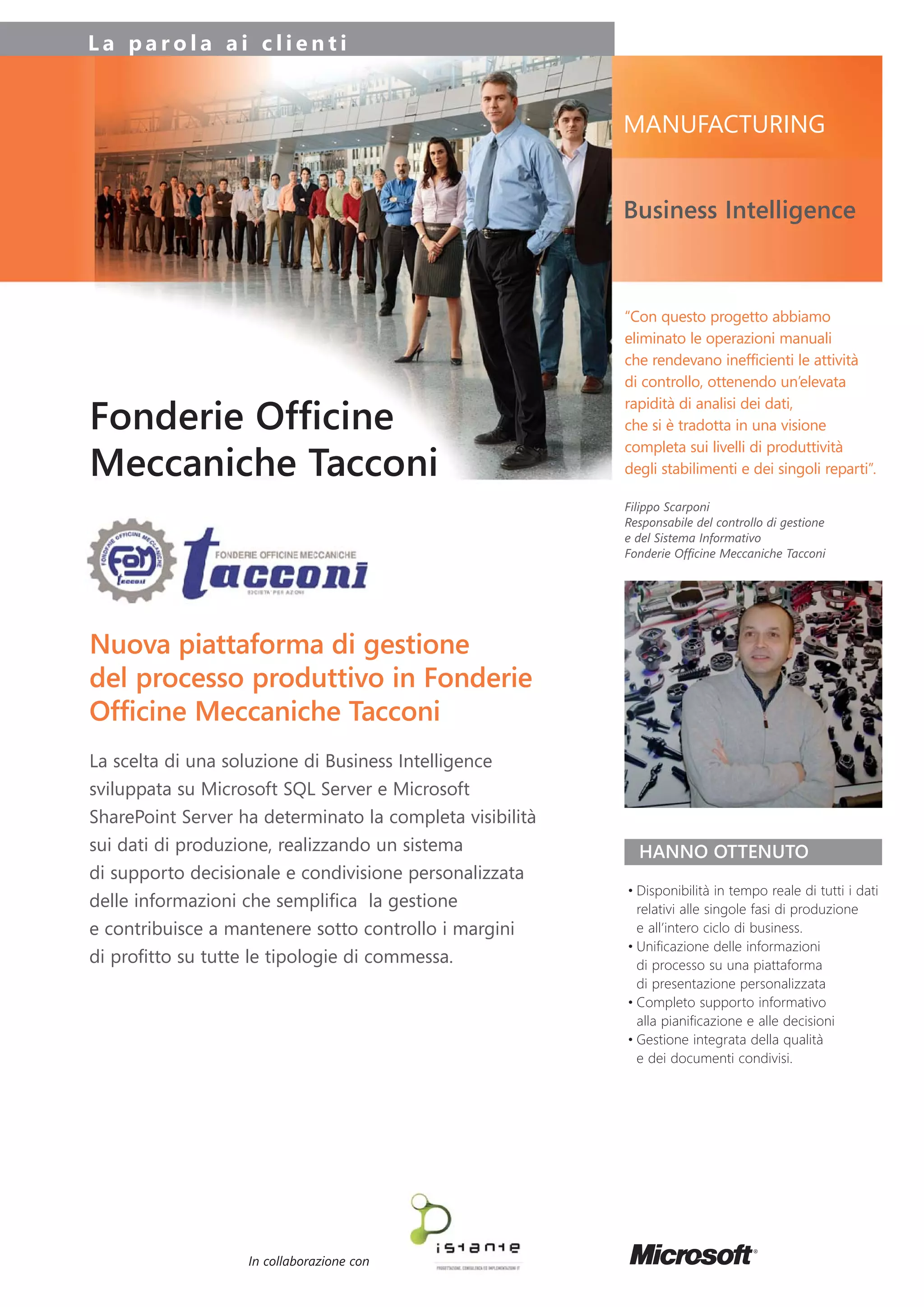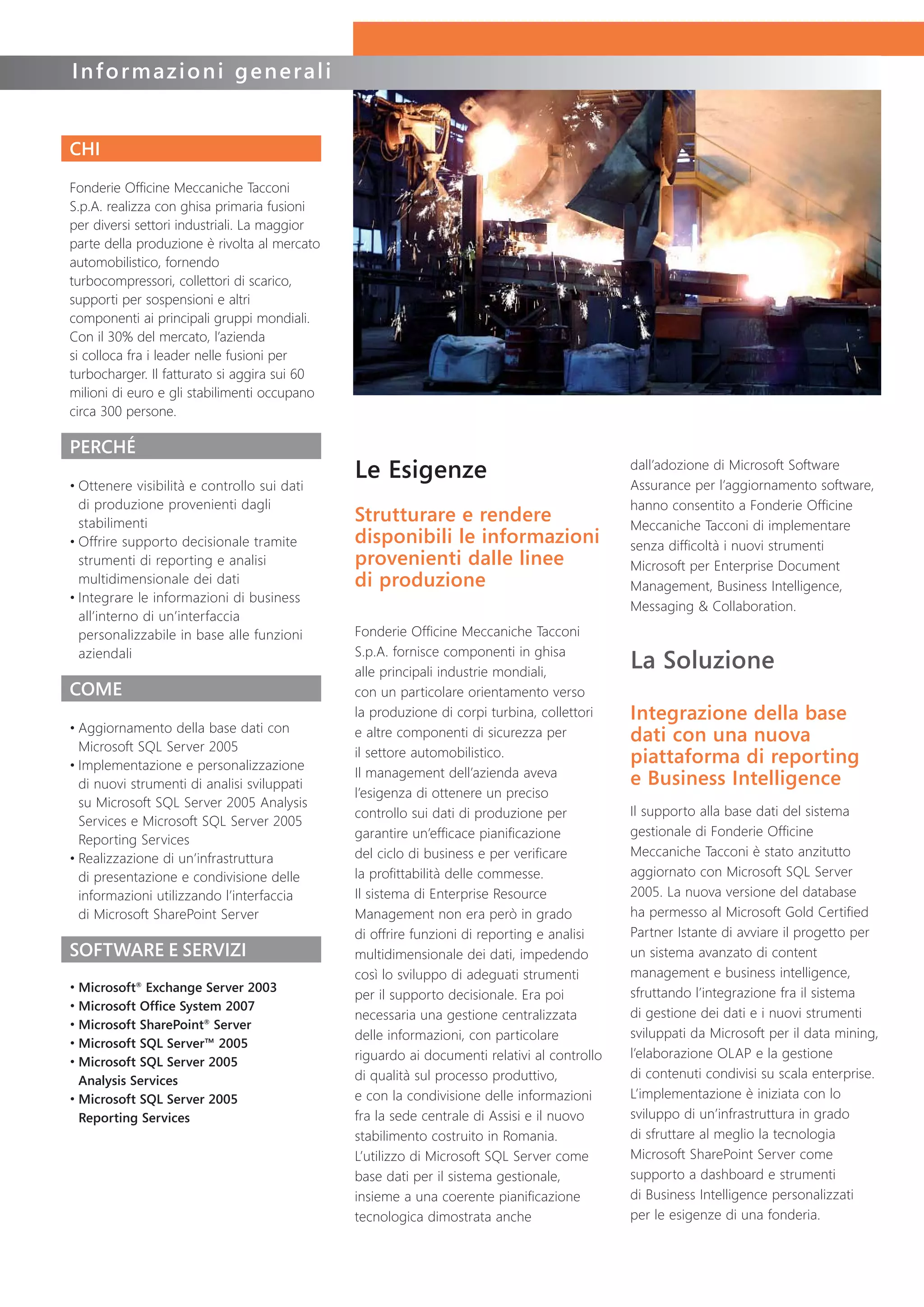 Fonderie Officine Meccaniche Tacconi ha implementato una nuova piattaforma di business intelligence utilizzando Microsoft SQL Server e SharePoint, che ha eliminato operazioni manuali, garantito analisi rapide e fornito visibilità completa sui dati di produzione. Questo sistema ha portato a un miglioramento della gestione della qualità, supporto decisionale e integrazione delle informazioni, incrementando la produttività e riducendo i tempi di collaudo. La soluzione ha permesso una centralizzazione dei dati e una pianificazione più efficace, con un focus sulla qualità e la trasparenza dei processi produttivi.