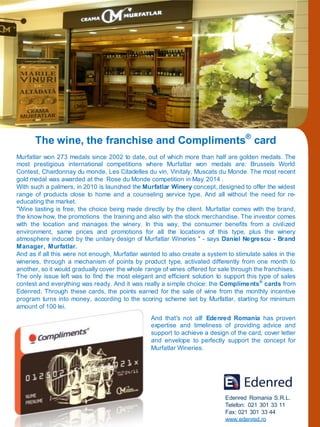 Murfatlar winery has won over 273 medals since 2002, including over half being gold medals, from prestigious international wine competitions. In 2010, Murfatlar launched its winery franchise concept to offer its products and services close to consumers. Franchisees provide the retail space while Murfatlar supplies the brand, products, promotions and training. To further stimulate sales in its franchises, Murfatlar created a point-based incentive program for selling its wine varieties. Edenred's Compliments gift cards provided an elegant solution for franchisees to redeem their earned points for cash rewards according to Murfatlar's scoring scheme.