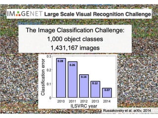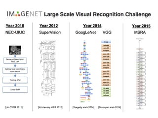 This document summarizes the evolution of convolutional neural networks (CNNs) from LeNet to ResNet. It discusses key CNN architectures like AlexNet, VGGNet, GoogLeNet, and ResNet and the techniques they introduced such as ReLU, dropout, batch normalization, and residual connections. These techniques helped reduce overfitting and allowed training of much deeper networks, leading to substantially improved accuracy on the ImageNet challenge over time, from AlexNet's top-5 error of 15.3% in 2012 to ResNet's 3.57% in 2015.